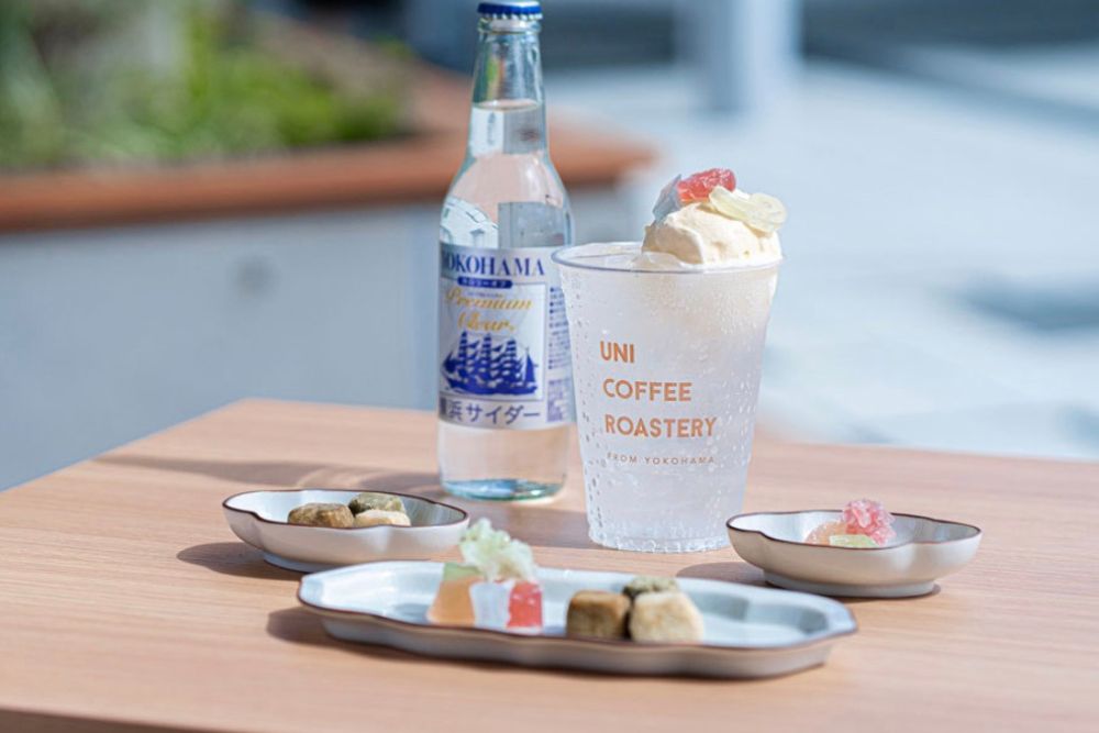 地元の銘菓・長池彩華堂の「小松の宝石 ishika」や菓子工房よどがわの「茶玉」が少量ずつ楽しめるプレートや、UNI COFFEE ROASTERYが拠点とする横浜発の「横浜サイダー」に小松市の長池彩華堂の琥珀糖菓子「石華」を散りばめた、見た目も可愛らしいドリンクなどがお楽しみいただけます。